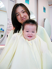 新生児からのカットも受け付けています。お母さんに抱っこされて、一緒にカット!赤ちゃん専用のクロスもございますので、安心していらして下さい。